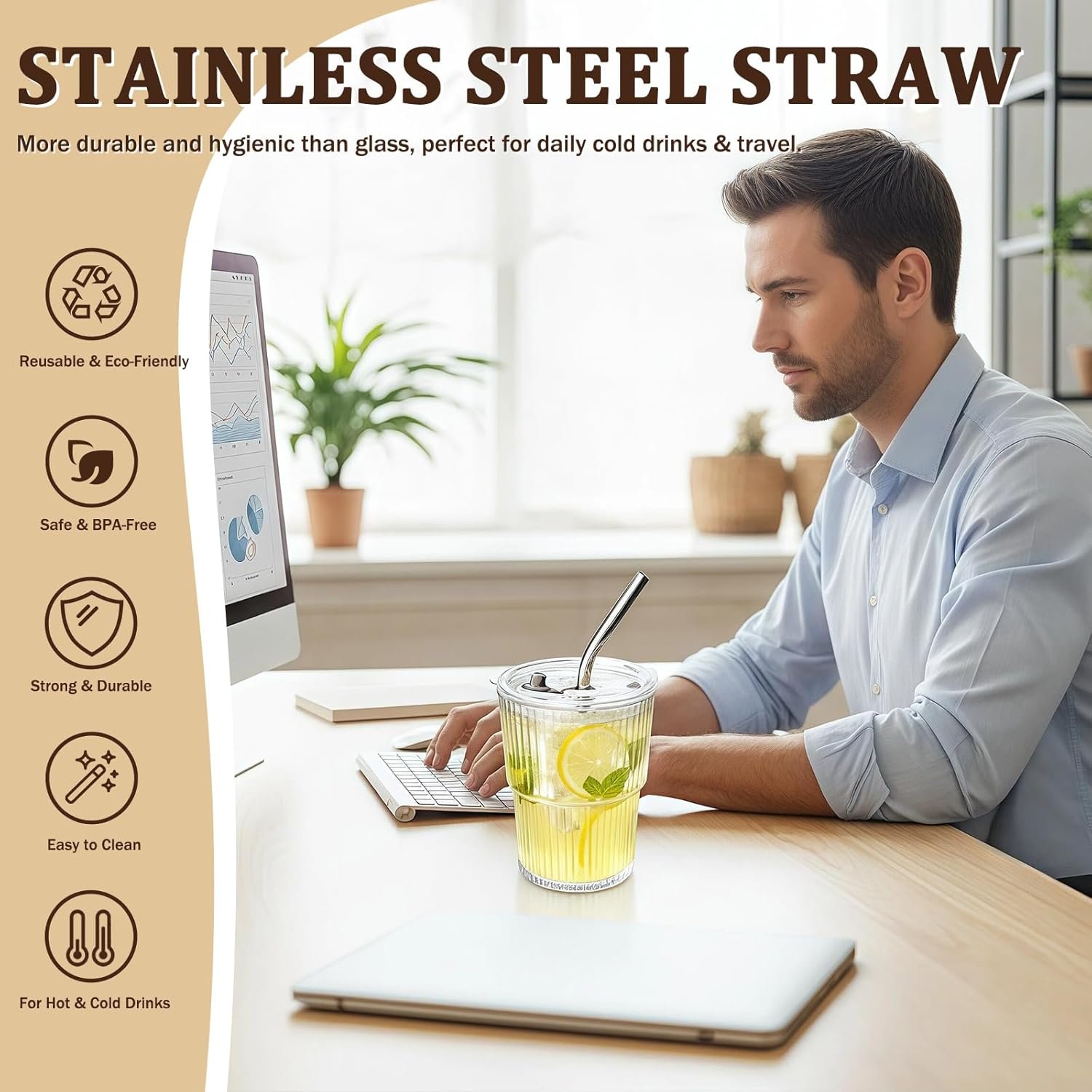 - Reinforced Stainless Steel Straw — Unbreakable & Reusable Comes with a sturdy stainless steel straw that resists bending or cracking—a durable and eco-friendly upgrade from plastic. Perfect for smoothies, lattes, and cold drinks on the go. Easy to rinse under running water after use.
